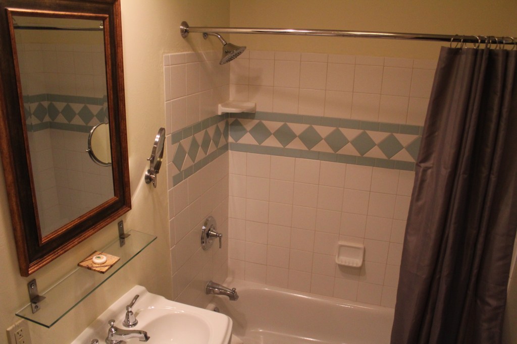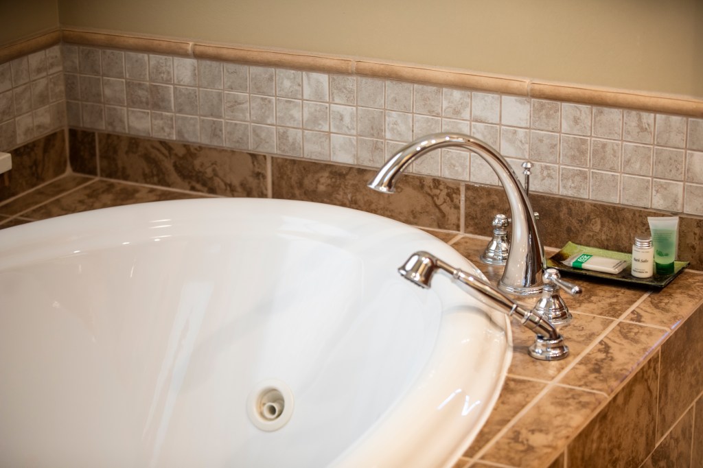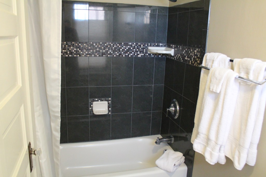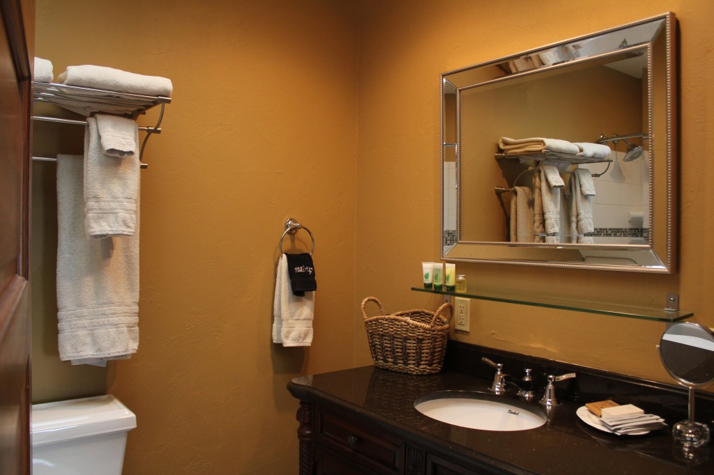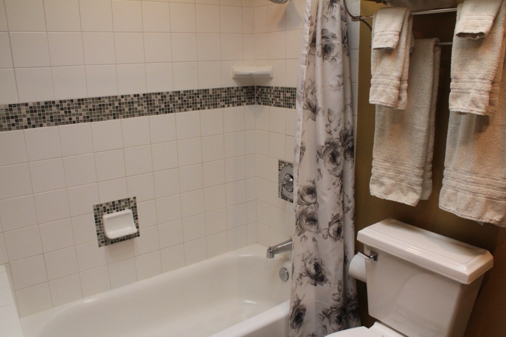 Queen bed room, with full tub & shower. Theater view, air conditioning, complimentary WiFi, coffee maker, flat screen TV, hair dryer, robes, bottled water and snacks.