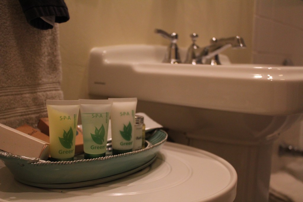 Corner suite with King bed and large bathroom with full tub and shower. Park and theater view, air conditioning, complimentary WiFi, coffee maker, flat screen TV, hair dryer, iron & iron board, robes, bottled water and snacks.