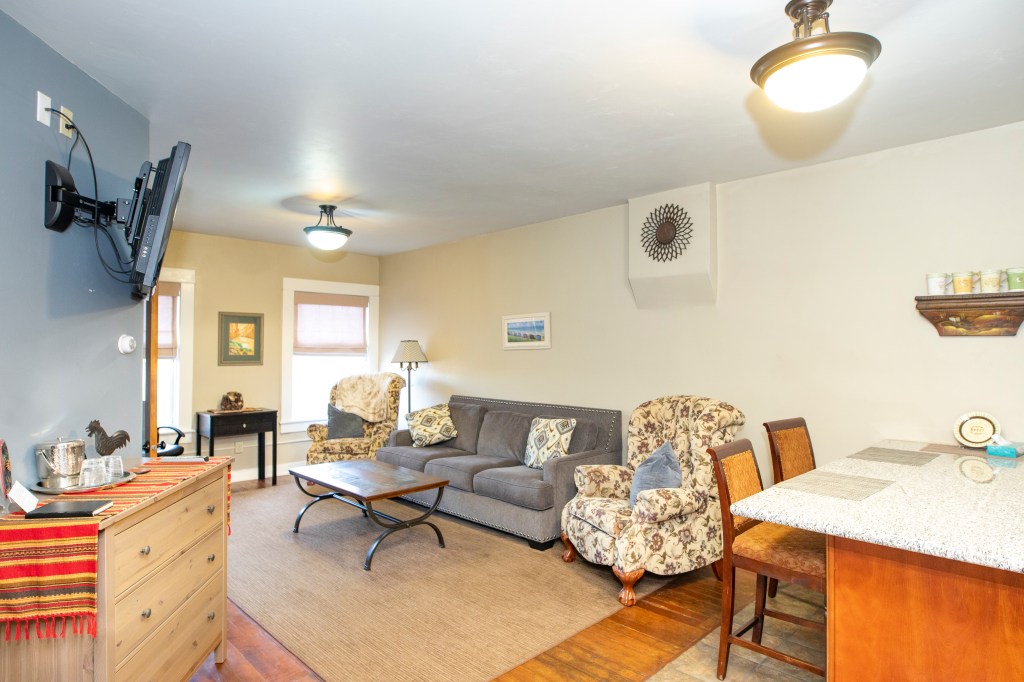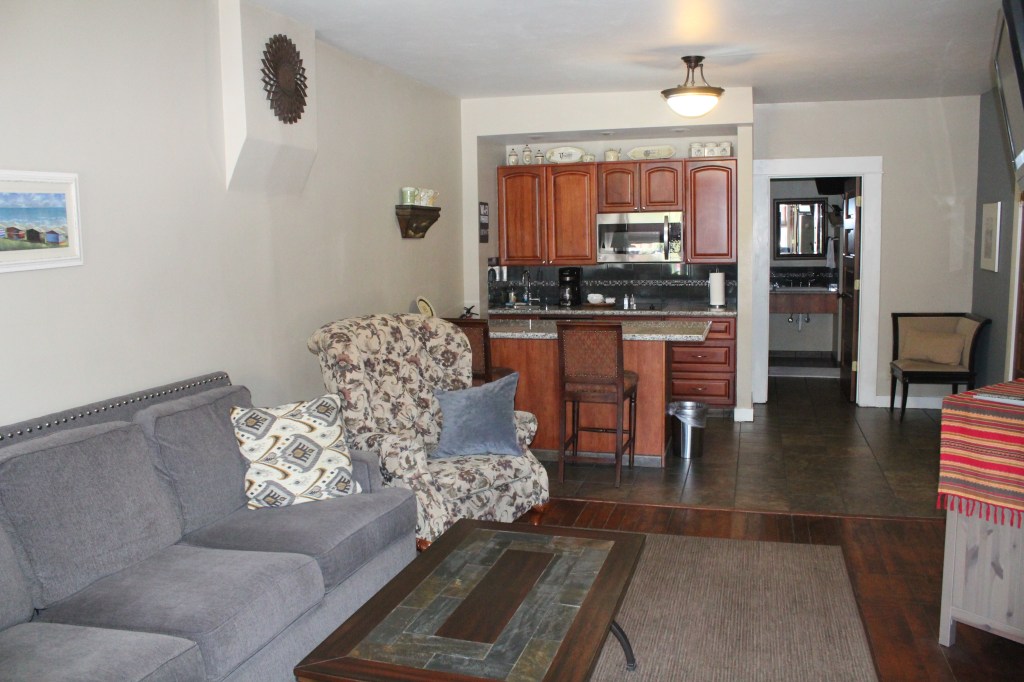 Large king bed suite with separate living area and kitchenette. Bath with double sinks, full tub and shower. Refrigerator, Microwave, range top, cooking utensils, coffee maker, etc. Park view, air conditioning, complimentary WiFi, hair dryer, iron & iron board, robes, bottled water and snacks. Sleeps 2. Laundry facilities available.