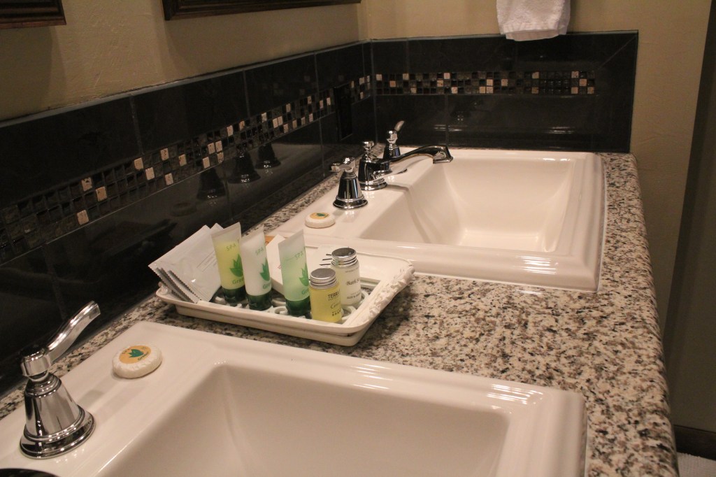 Two Queen beds with large shower. Theater view, air conditioning, complimentary WiFi, refrigerator, coffee maker, flat screen TV, hair dryer, robes, bottled water and snacks.